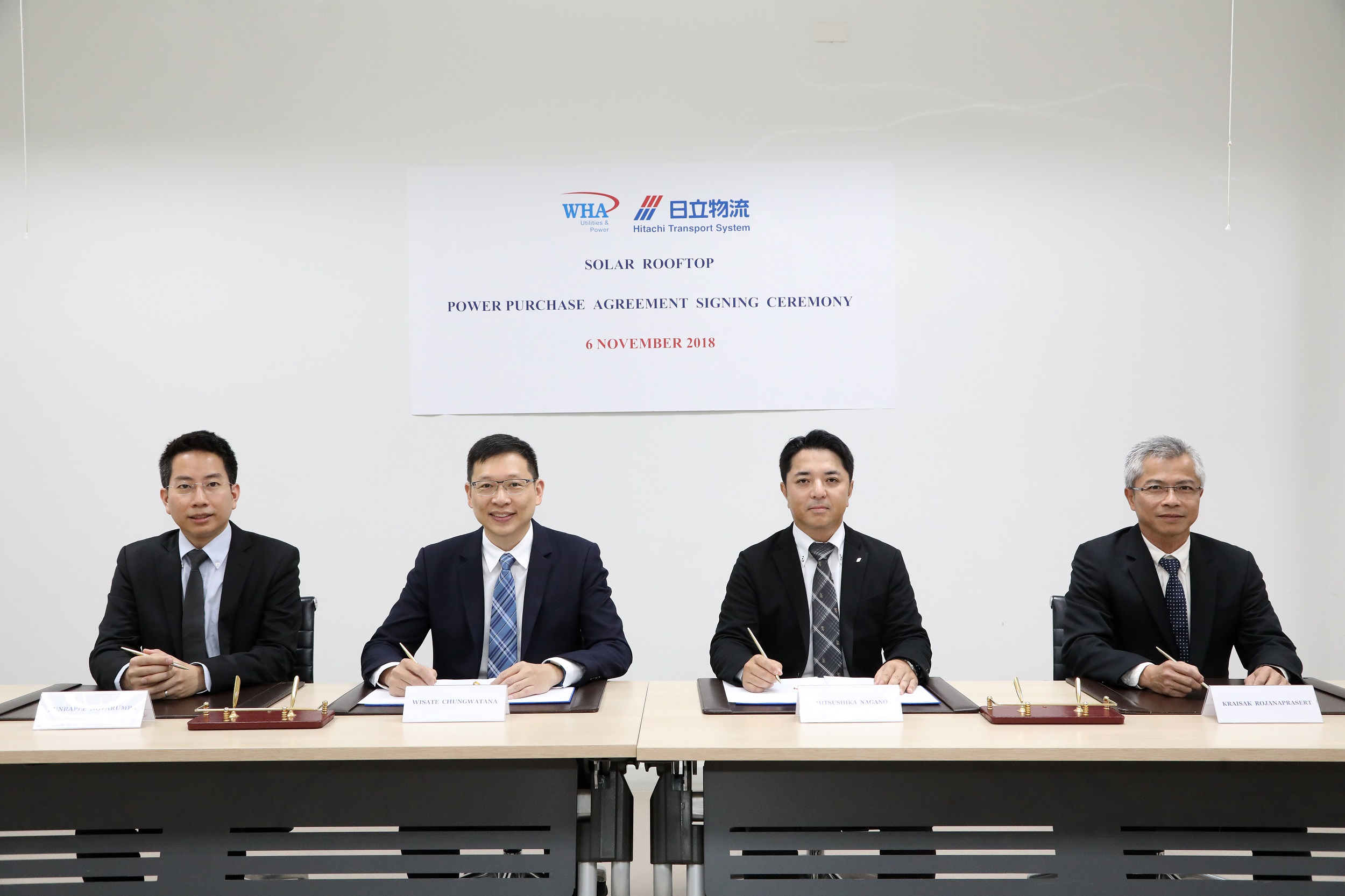 เมื่อเร็วๆ นี้ นายวิเศษ จูงวัฒนา (กลางซ้าย) ประธานเจ้าหน้าที่บริหาร บริษัท ดับบลิวเอชเอ ยูทิลิตี้ส์ แอนด์ พาวเวอร์ จำกัด (มหาชน) หรือ WHAUP นายมิซึชิกะ นากาโนะ (กลางขวา) Managing Director และนายไกรศักดิ์ โรจนประเสริฐ (ขวา) General Manager Logistics Business บริษัท ฮิตาชิ ทรานสปอร์ต ซิสเต็ม แวนเทค (ประเทศไทย) จำกัด ผู้ประกอบการธุรกิจด้านโลจิสติกส์ และระบบการขนส่งรายใหญ่ของประเทศญี่ปุ่น ร่วมลงนามในสัญญาติดตั้งแผง Solar Rooftop ขนาด 501.6 KW บนพื้นที่หลังคาโรงงานของ Hitachi ประมาณ 5,448 ตารางเมตร ซึ่งจะช่วยทดแทนการใช้พลังงานเดิมได้ถึง 21.3% และลดการปล่อย CO2 ประมาณ 350 ตันต่อปี และสามารถจ่ายไฟฟ้าให้กับ Hitachi ที่ 700,000 หน่วยต่อปี โดยคาดว่าจะสามารถเปิดดำเนินการเชิงพาณิชย์ (COD) ให้กับลูกค้าได้ประมาณ เมษายน 2562