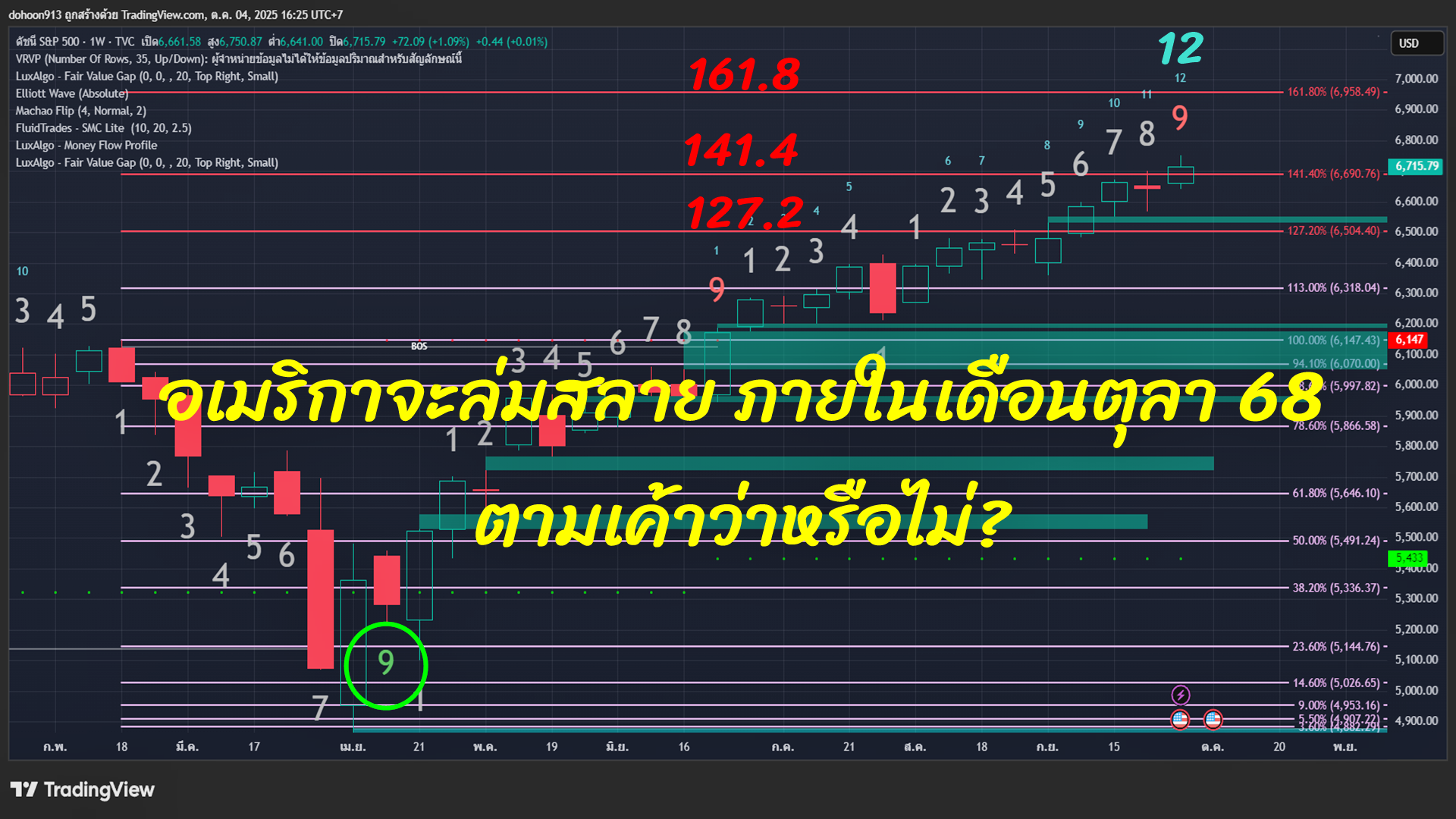 จากภาพ ผมกำลังจะอธิบายว่า S&P500 ที่เปรียบได้กับ SET50 ของไทย คือ โครงสร้างหลักของตลาดหุ้นอเมริกา มีโอกาสเทลงแรงๆในเดือนตุลาคม 68 ด้วยเหตุผลดังต่อไปนี้ครับ