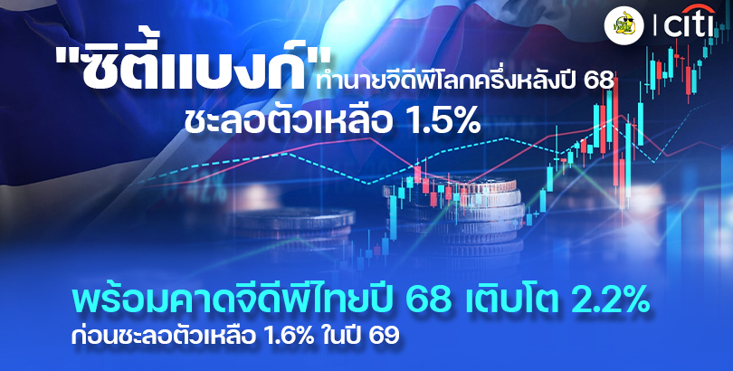 สำนักข่าวหุ้นอินไซด์ (9 ตุลาคม 2568 )---- "ซิตี้แบงก์" คาดการณ์จีดีพีโลกครึ่งหลังปี 68 ชะลอตัวเหลือ 1.5% หลังเผชิญแรงกดดันทางการค้า พร้อมคาดจีดีพีไทยปี 68 เติบโต 2.2% ก่อนชะลอตัวเหลือ 1.6% ในปี 69 รับผลท่องเที่ยวและส่งออก ธนาคารซิตี้แบงก์ ชี้เศรษฐกิจโลกในครึ่งหลังของปี 2568 ชะลอตัวเหลือ 1.5% ท่ามกลางภาวะเศรษฐกิจโลกที่ผันผวนและความท้าทายทางการค้าขณะที่เศรษฐกิจไทยตลอดปี 2568 คาดว่าจะเติบโตที่ 2.2% และชะลอลงเหลือ 1.6% ในปี 2569 โดยได้รับผลกระทบจากการชะลอตัวของการส่งออก การฟื้นตัวของการลงทุนภาคเอกชนที่ยังไม่กว้างขวาง และผลการดำเนินงานของภาคการท่องเที่ยวที่ยังไม่ถึงศักยภาพที่คาดหวัง