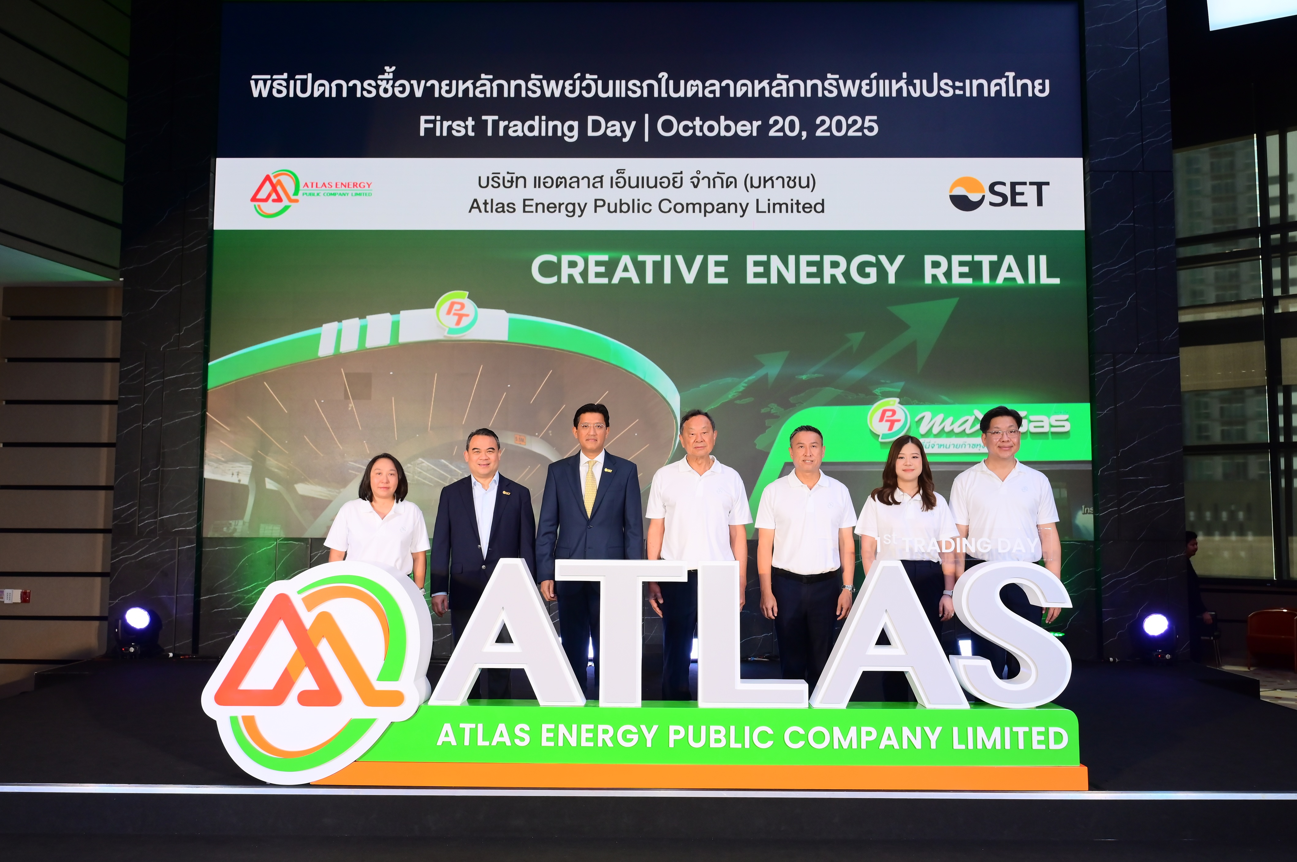 สำนักข่าวหุ้นอินไซด์( 20 ตุลาคม 2568)----อัสสเดช คงสิริ กรรมการและผู้จัดการ สรวิศ ไกรฤกษ์ รองผู้จัดการ สายงานผู้ออกหลักทรัพย์ และสายงานการตลาด ตลาดหลักทรัพย์แห่งประเทศไทย พร้อมด้วย สุวัชชัย พิทักษ์วงศาภรณ์ กรรมการผู้จัดการ บมจ. แอตลาส เอ็นเนอยี (ATLAS) ร่วมพิธีเปิดการซื้อขายวันแรกในตลาดหลักทรัพย์ฯ ในวันที่ 20 ตุลาคม 2568 ด้วยมูลค่าหลักทรัพย์ ณ ราคา IPO 4,255.26 ล้านบาท โดย ATLAS เป็นหนึ่งในผู้นำธุรกิจจำหน่ายก๊าซ LPG ครบวงจร ภายใต้แบรนด์ "PT"
