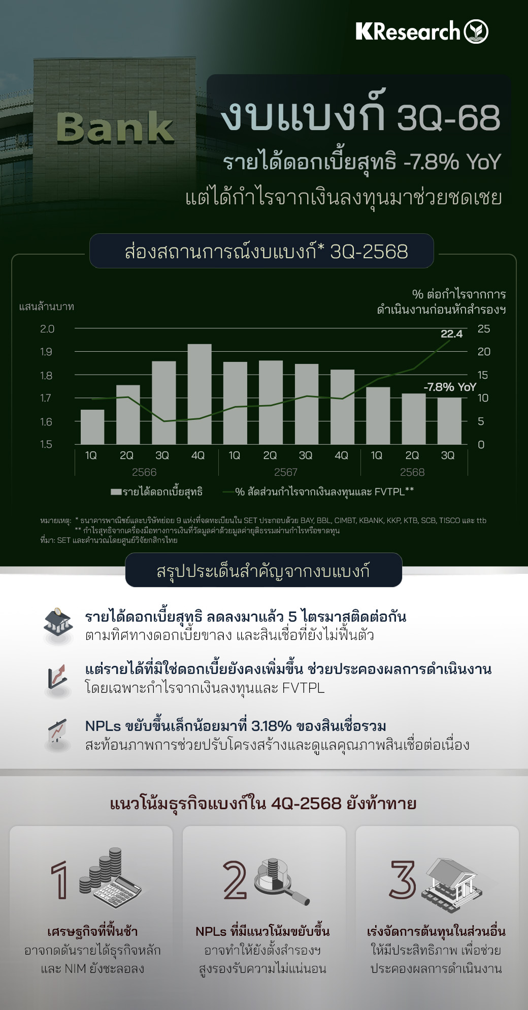 ศูนย์วิจัยกสิกรไทย งบแบงก์ 3Q-68 รายได้ดอกเบี้ยสุทธิ -7.8% YoY แต่ได้กำไรจากเงินลงทุนมาช่วยชดเชย