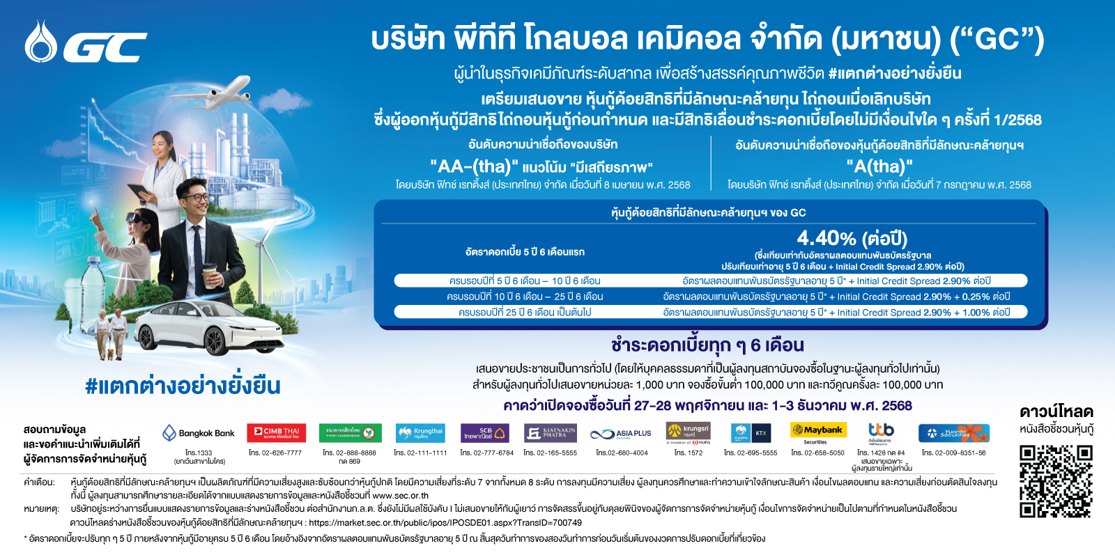 บริษัท พีทีที โกลบอล เคมิคอล จำกัด (มหาชน) หรือ GC ผู้นำในธุรกิจเคมีภัณฑ์ระดับสากล และแกนนำธุรกิจเคมีภัณฑ์ของกลุ่ม ปตท. ประกาศดอกเบี้ยหุ้นกู้ด้อยสิทธิที่มีลักษณะคล้ายทุน ไถ่ถอนเมื่อเลิกบริษัท ซึ่งผู้ออกหุ้นกู้มีสิทธิไถ่ถอนหุ้นกู้ก่อนกำหนด  ("หุ้นกู้ด้อยสิทธิที่มีลักษณะคล้ายทุนฯ") สำหรับ 5 ปี 6 เดือนแรกที่ 4.40% ต่อปี คาดเสนอขายต่อผู้ลงทุนทั่วไป (Public offering) ระหว่างวันที่ 27 – 28 พฤศจิกายน และ 1 – 3 ธันวาคม 2568 ผ่าน 12 สถาบันการเงิน