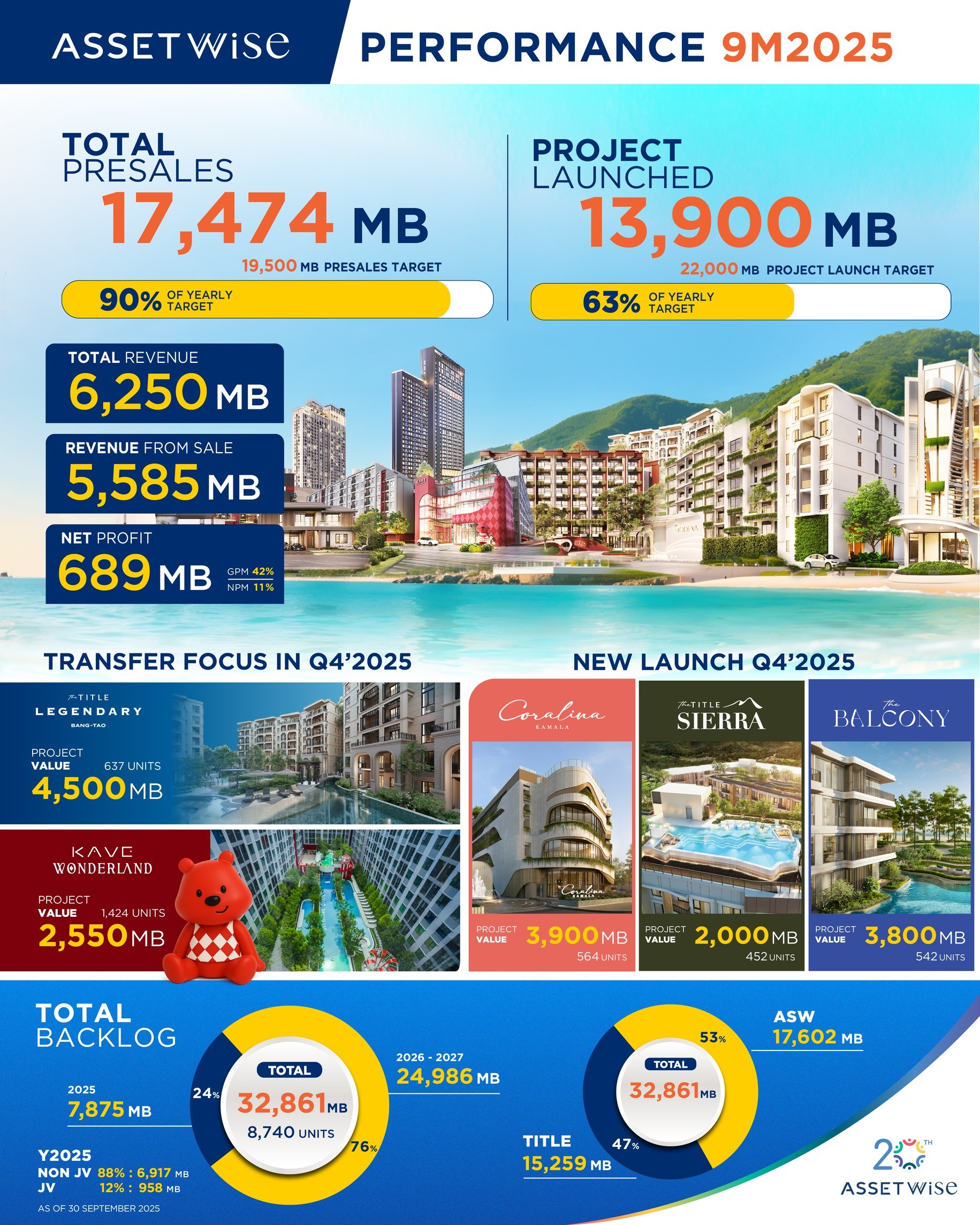 สำนักข่าวหุ้นอินไซด์ (7 พฤศจิกายน 2568 )-----ASW เปิดผลประกอบการ 9 เดือนแรกปี 2568 ทำรายได้รวม 6,250 ล้านบาท กำไรสุทธิสะสม 689 ล้านบาท และยอดขาย 17,474 ล้านบาท พร้อมแบ็กล็อกกว่า 32,861 ล้านบาท คาดทยอยรับรู้รายได้ยาวถึงปี 2570 ขยายแผนเปิดโครงการใหม่ทั้งปีเพิ่มเป็น 11 โครงการ มูลค่ารวม 23,600 ล้านบาท มั่นใจตลาดอสังหาฯ ยังมีแรงหนุนจากภาคการท่องเที่ยวที่ฟื้นตัว ลุยโค้งสุดท้ายเปิด 3 โครงการใหม่ในภูเก็ตมูลค่า 9,700 ล้านบาท รองรับกลุ่มต่างชาติกำลังซื้อสูง เตรียมโอนโครงการสร้างเสร็จใหม่ตามแผน หนุนรายได้ตามเป้าทั้งปี 10,500 ล้านบาท เชื่อมั่นพอร์ตภูเก็ตช่วยเสริมแกร่งให้บริษัทฯเติบโตอย่างมั่นคงทั้งปีนี้และในระยะยาว