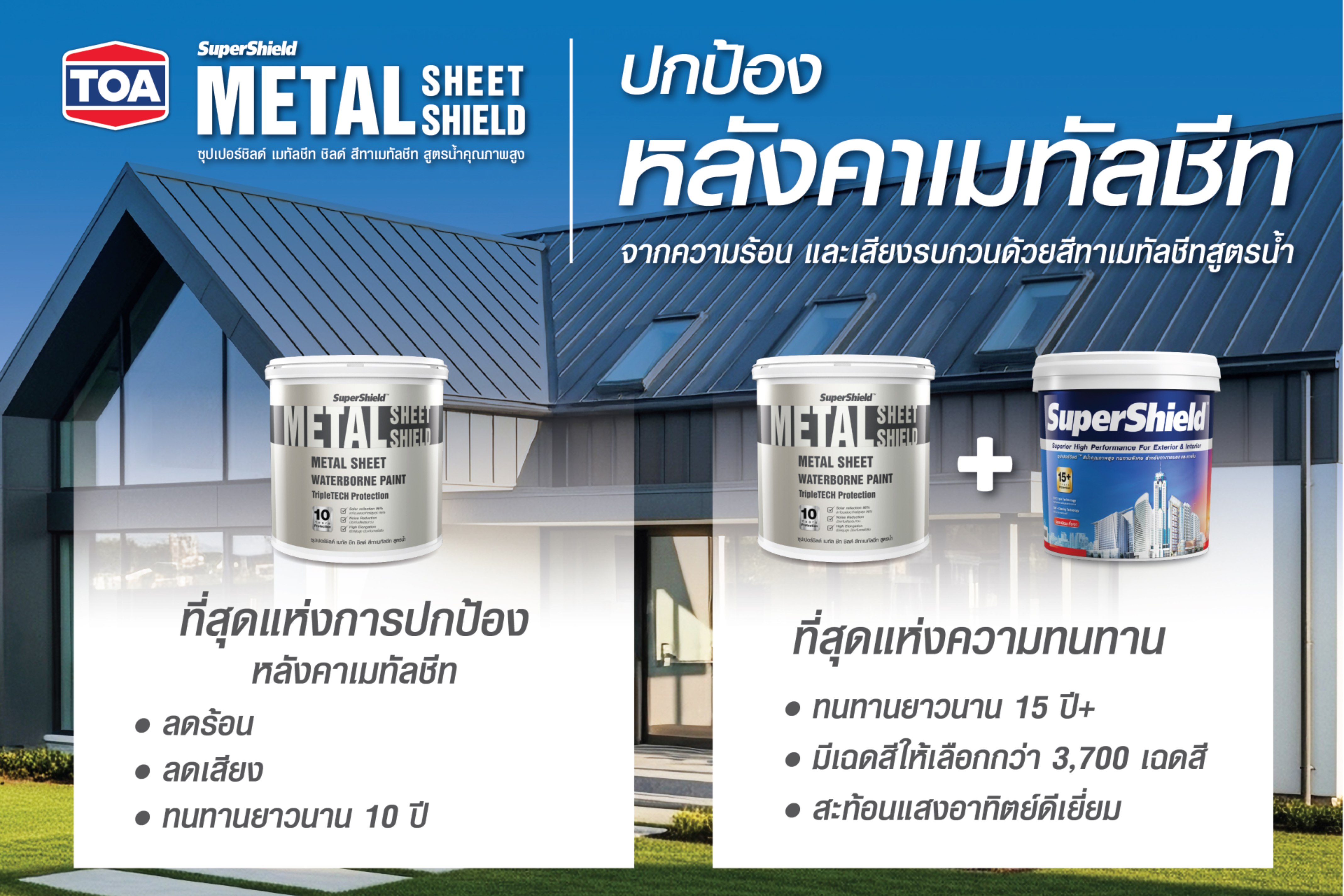 สำหรับนวัตกรรมใหม่ สีทาหลังคาเมทัลชีท ‘ซุปเปอร์ชิลด์ เมทัลชีท ชิลด์’ (SuperShield Metal Sheet Shield)  ที่ได้รับการพัฒนาขึ้นด้วยเทคโนโลยี 3X Triple Tech Protection พลังปกป้องเหนือระดับ เพื่อยกระดับมาตรฐานการปกป้องหลังคาโลหะให้ทนทาน เย็นสบาย และเงียบสงบกว่าที่เคย ด้วยคุณสมบัติเด่น 3 ประการ ไม่ว่าจะเป็น 1.Solar Reflection สะท้อนแสงอาทิตย์สูงสุด 96% สะท้อนได้ดีกว่าเมทัลชีทที่ไม่เคลือบสี มากกว่า 2 เท่า และยังสามารถลดอุณหภูมิที่พื้นผิวได้มากกว่าเมทัลชีทที่ไม่ได้เคลือบสีมากถึง 14 องศาเซลเซียส*  2.Noise Reduction ลดเสียงได้มากกว่าถึง 16% เมื่อเทียบกับเมทัลชีทเปลือย และสามารถช่วยลดเสียงได้มากกว่าเมทัลชีทที่บุด้วยพียูโฟมถึงเท่าตัว* 3.High Elongation เนื้อฟิล์มหนา ยืดหยุ่นมากกว่าสีน้ำทั่วไป ช่วยปกป้องและยืดอายุหลังคา    *หมายเหตุ: ค่าผลทดสอบเป็นผลความแตกต่างของอุณหภูมิสูงสุดเปรียบเทียบกัน และร้อยละ (%) ผลต่างของเสียง ซึ่งเป็นการทดสอบจากบ้านจำลอง