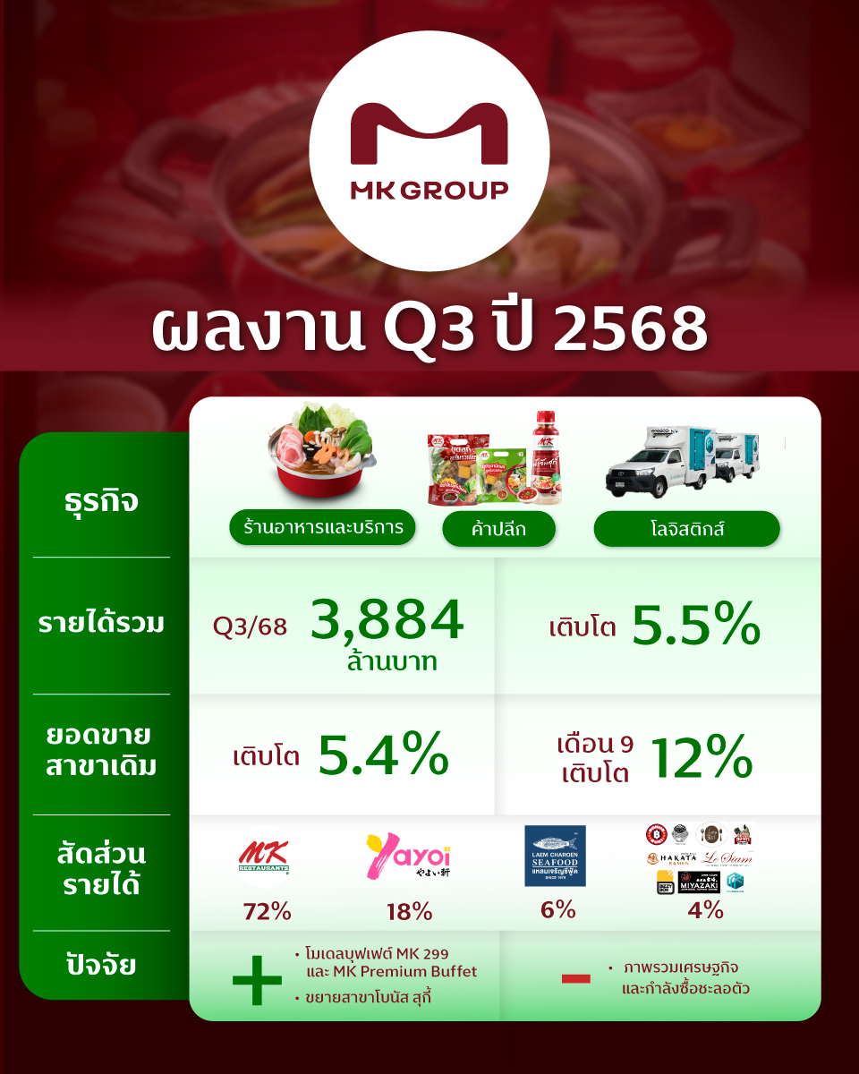 สำนักข่าวหุ้นอินไซด์ (13 พฤศจิกายน 2568 )-----หลังจาก MK ส่งบุฟเฟต์ลุยตลาด ทั้ง “MK คุ้มเกินคุ้ม 299 บาท” และ “MK Premium Buffet” ส่งผลให้ยอดขายรวม ไตรมาส 3 ปี 2568 เติบโตขึ้นอย่างมีนัยสำคัญ โดยมีเทรนด์การเติบโตขึ้นต่อเนื่องในทุกไตรมาสตั้งแต่ต้นปี ซึ่งช่วยเสริมความแข็งแกร่งให้กับภาพรวมของกลุ่มในปีนี้
