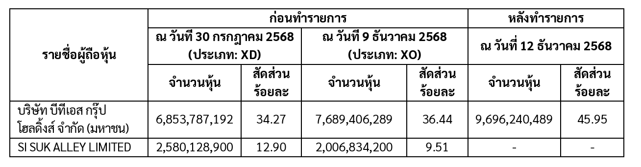 สำนักข่าวหุ้นอินไซด์( 19 ธันวาคม 2568 )-------บริษัท วีจีไอ จำกัด (มหาชน) VGI เปิดเผยว่า อ้างถึงแบบรายงานการได้มา/จำหน่ายหลักทรัพย์ของกิจการ (แบบ 246-2) ของบริษัท บีทีเอส กรุ๊ป โฮลดิ้งส์ จำกัด (มหาชน) ประจำวันที่ 16 ธันวาคม 2568 และ SI SUK ALLEY LIMITED ประจำวันที่ 17 ธันวาคม 2568 ที่เผยแพร่ โดยสำนักงานคณะกรรมการกำกับหลักทรัพย์และตลาดหลักทรัพย์ ซึ่งมีการได้มา/จำหน่ายหลักทรัพย์โดยวิธีการ Big Lot นั้น บริษัท วีจีไอ จำกัด (มหาชน) (“บริษัทฯ”) ขอแจ้งการเปลี่ยนแปลงโครงสร้างการถือหุ้นของผู้ถือหุ้นราย ใหญ่ของบริษัทฯ ทั้งสองราย เป็นดังนี