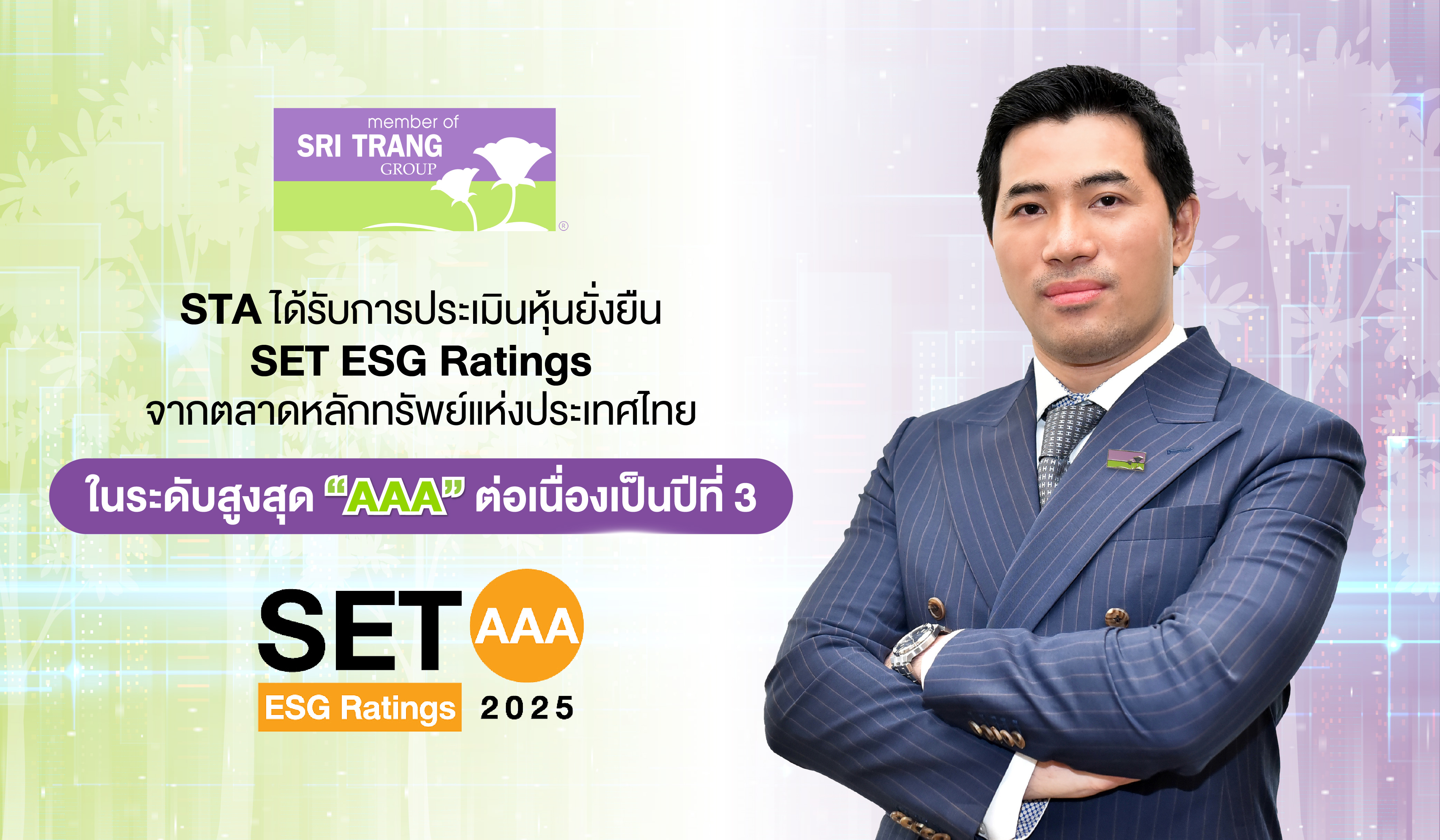 สำหรับการประเมินหุ้นยั่งยืน SET ESG Ratings ประจำปี 2568 มีบริษัทจดทะเบียนที่ได้รับการประกาศผลรวมทั้งสิ้น 265 บริษัท ซึ่ง STA เป็นหนึ่งใน 102 บริษัท ที่ได้รับการประเมินในระดับ "AAA" สะท้อนถึงการยกระดับการดำเนินงานของบริษัทฯ ที่ให้ความสำคัญกับการบริหารจัดการพลังงานอย่างมีประสิทธิภาพและการใช้พลังงานทดแทน เช่น พลังงานแสงอาทิตย์ เพื่อลดการปล่อยก๊าซเรือนกระจก พร้อมปรับปรุงกระบวนการผลิตและเครื่องจักรให้ประหยัดพลังงานและเป็นมิตรต่อสิ่งแวดล้อม บริษัทฯ ยังสนับสนุนการพัฒนาชุมชนแบบมีส่วนร่วม ส่งเสริมคุณภาพชีวิต การจ้างงานท้องถิ่น การเข้าถึงการศึกษา และสิทธิทางเศรษฐกิจ สังคม และวัฒนธรรมของชุมชน ด้านห่วงโซ่อุปทาน บริษัทฯ กระจายแหล่งจัดหาและตั้งโรงงานทั้งในและต่างประเทศ บริหารความสัมพันธ์ซัพพลายเออร์ ป้องกันการผูกขาด และควบคุมความขัดแย้งผลประโยชน์ พร้อมระบบตรวจสอบย้อนกลับวัตถุดิบ (Traceability) เพื่อความโปร่งใส ปฏิบัติตามกฎหมาย และไม่กระทบต่อสิ่งแวดล้อมหรือชุมชน การได้รับการประเมินในระดับสูงสุดอย่างต่อเนื่องสะท้อนถึงความมุ่งมั่นของบริษัทฯ ในการดำเนินธุรกิจอย่างรับผิดชอบ โปร่งใส และยั่งยืน เพื่อสร้างคุณค่าในระยะยาวแก่ผู้มีส่วนได้เสียทุกกลุ่ม