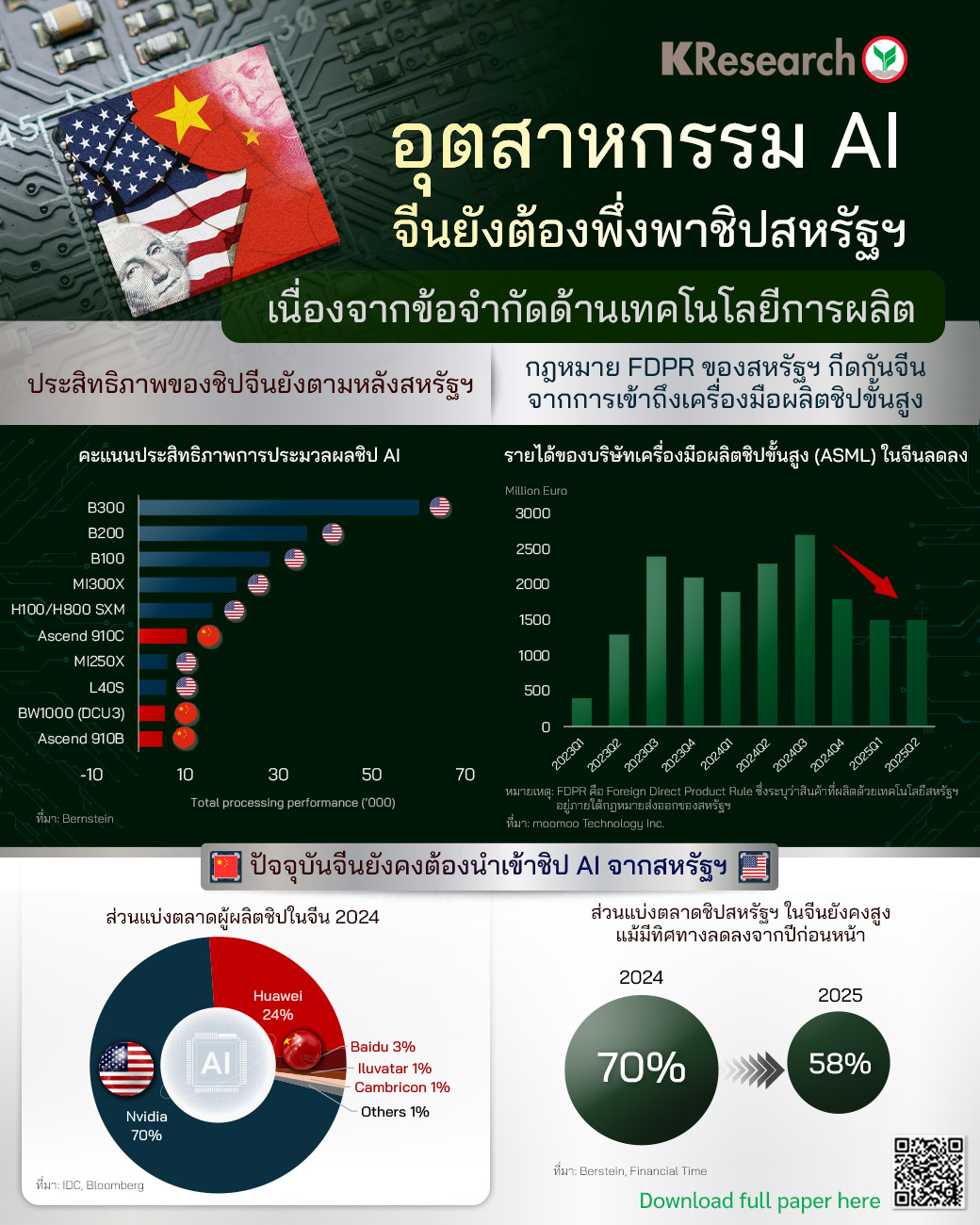 • จากข้อจำกัดดังกล่าว จีนจึงยังมีความจำเป็นต้องนำเข้าชิปจากต่างประเทศ โดยในปี 2024 ชิปจากสหรัฐฯ ครองส่วนแบ่งการใช้งานในจีนสูงถึงประมาณ 70% และคาดว่าสัดส่วนดังกล่าวจะยังอยู่ในระดับสูงที่ราว 58% ในปี 2025