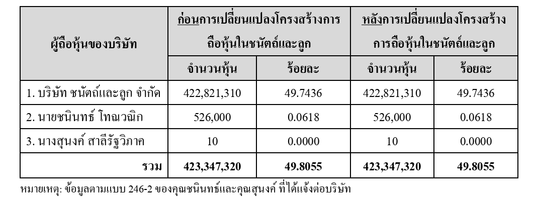 (2) เมื่อวันที่ 29 มกราคม 2569 นางสุนงค์ สาลีรัฐวิภาค (“คุณสุนงค์”) ได้ซื้อหุ้นในชนัตถ์และลูก จำนวน 2,005,065 หุ้นหรือคิดเป็นสัดส่วนร้อยละ 26.66 ของหุ้นที่ออกจำหน่ายแล้วทั้งหมดของชนัตถ์และ ลูก จากนางสินี เธียรประสิทธิ์ ภายหลังการซื้อหุ้นดังกล่าว คุณสุนงค์ถือหุ้นในชนัตถ์และลูกร้อยละ 46.62 ของหุ้นที่ออกจำหน่ายแล้วทั้งหมดของชนัตถ์และลูก ส่งผลให้สัดส่วนการถือหุ้นของคุณสุนงค์ในชนัตถ์และลูกเกินร้อยละ 30 ของจำนวนสิทธิออกเสียงทั้งหมด ชนัตถ์และลูกจึงมีสถานะเป็นนิติบุคคลตาม มาตรา 258 แห่งพระราชบัญญัติหลักทรัพย์และตลาดหลักทรัพย์ พ.ศ. 2535 (และที่แก้ไขเพิ่มเติม) ของ คุณสุนงค์ แต่การซื้อหุ้นดังกล่าวไม่เข้าหลักเกณฑ์ที่คุณสุนงค์ต้องมีหน้าที่ทำคำเสนอซื้อหลักทรัพย์ของ บริษัทตามหลักเกณฑ์การได้มาซึ่งอำนาจควบคุมอย่างมีนัยสำคัญในนิติบุคคลที่เป็นผู้ถือหุ้นของกิจการอยู่ แล้ว (Chain Principle) ภายใต้กฎหมายหลักทรัพย์ที่เกี่ยวข้องแต่อย่างใด โดยคุณสุนงค์ได้รายงานการได้มา ซึ่งนิติบุคคลตามมาตรา 258 ตามแบบ 246-2 ต่อสำนักงานคณะกรรมการกำกับหลักทรัพย์และตลาด หลักทรัพย์ เป็นที่เรียบร้อยแล้ว