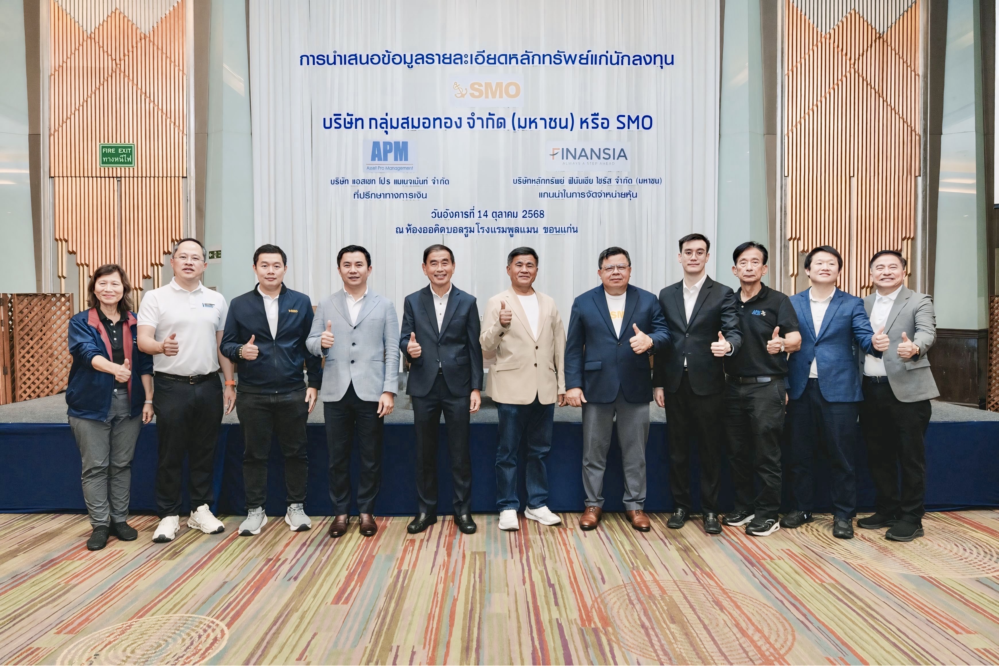 สำนักข่าวหุ้นอินไซด์ (21 ตุลาคม 2568 )-----นายกิตติพงษ์ พวงมาลา ประธานเจ้าหน้าที่บริหาร นายกุศล ศรีเปารยะ  ประธานเจ้าหน้าที่บริหารการเงิน บริษัท กลุ่มสมอทอง จำกัด (มหาชน) หรือ SMO  หนึ่งในผู้นำในการผลิตและจำหน่ายน้ำมันปาล์มดิบของประเทศไทย  ซึ่งมีโรงงาน 4 จุดครอบคลุมพื้นที่ยุทธศาสตร์สำคัญของปาล์มน้ำมัน และธุรกิจผลิตและจำหน่ายไฟฟ้าจากเชื้อเพลิงก๊าซชีวภาพ พร้อมด้วยดร.สมภพ ศักดิ์พันธ์พนม ประธานกรรมการ นายสมศักดิ์ ศิริชัยนฤมิตร ประธานเจ้าหน้าที่บริหาร นายสุริยา ธรรมธีระ รองกรรมการผู้จัดการ บริษัท แอสเซท โปร แมเนจเม้นท์ จำกัด (APM) ในฐานะที่ปรึกษาทางการเงินและนายภควัฒน์ ตุลยนิติกุล ผู้อำนวยการอาวุโส บริษัทหลักทรัพย์ ฟินันเซียไซรัส จำกัด (มหาชน) ในฐานะแกนนำการจัดจำหน่ายและรับประกันการจำหน่าย ร่วมนำเสนอข้อมูลธุรกิจ วิสัยทัศน์ ข้อมูลทางการเงิน และศักยภาพการเติบโตของบริษัท ให้แก่นักลงทุนในจังหวัดขอนแก่น โดยมีนักลงทุนให้ความสนใจเข้าร่วมรับฟังข้อมูลเป็นจำนวนมาก ณ โรงแรมพูลแมน ขอนแก่น ราชา ออคิด