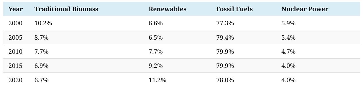 ข้อมูลจากตารางด้านล่างสะท้อนให้เห็นถึงแนวโน้มการใช้พลังงานหมุนเวียนทั่วโลกที่ชัดเจน โดยระหว่างปี 2000 ถึง 2010 สัดส่วนการใช้พลังงานหมุนเวียนทั่วโลกเพิ่มขึ้นเพียง 1.1% เท่านั้น อย่างไรก็ตาม 10 ปีถัดมา ในช่วง 2010 ถึง 2020 สัดส่วนดังกล่าวเพิ่มขึ้นอย่างรวดเร็วถึง 3.5% และความสามารถในการผลิตพลังงานหมุนเวียนยังทำสถิติสูงสุดต่อเนื่องมาตั้งแต่ปี 2021 เป็นต้นมา แนวโน้มนี้สะท้อนถึงการเปลี่ยนผ่านที่เกิดขึ้นอย่างจริงจังทั่วโลก