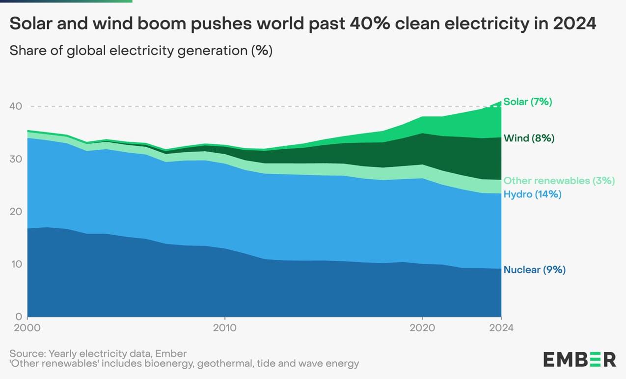 ทั้งนี้ สอดคล้องกับข้อมูลล่าสุดในปี 2024 ซึ่งพบว่าสัดส่วนการผลิตพลังงานหมุนเวียนทั่วโลกเติบโตทะลุ 40% ถือเป็นระดับสูงสุดในประวัติการณ์ โดยเฉพาะพลังงานแสงอาทิตย์และพลังงานลมที่เป็นปัจจัยสำคัญช่วยผลักดันในการเพิ่มกำลังการผลิตไฟฟ้าจากพลังงานหมุนเวียน (ที่มา: World Economic Forum)