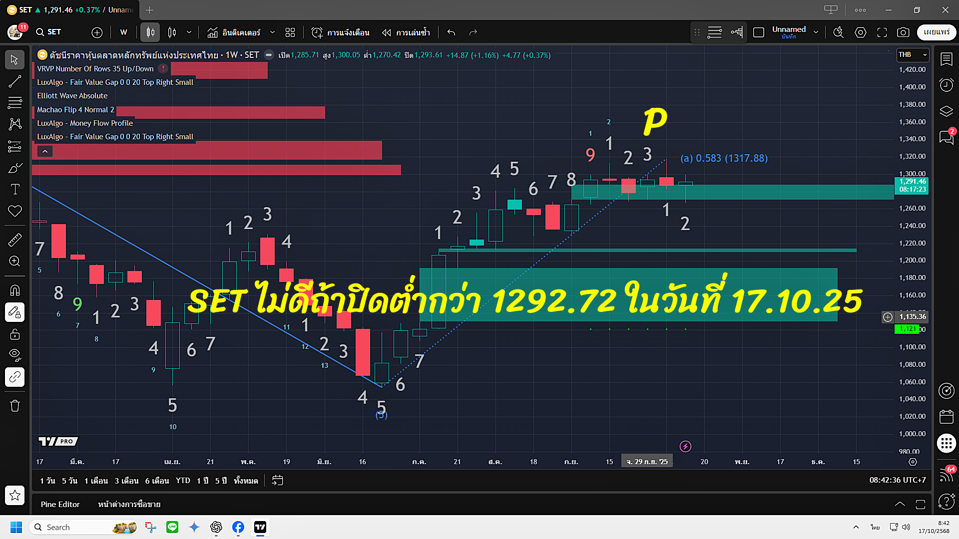 ก่อนหน้านี้ เราได้คุยกันไว้อย่างละเอียด ว่า 17.10.25 นี้ ทั้ง SET และ S&P500 จะครบ "แท่ง WEEK"ให้จับตาว่ารูปแบบ "Bearish Price Flip" จะเกิดการนับ "ทางลง" ต่อเนื่อง ภายใต้เงื่อนไขต่อไปนี้1. S&P500 ไม่ดีถ้าปิดต่ำกว่า 6664.36 ในวันที่ 17.10.25 ตามเวลาฝั่งอเมริกา ที่ไม่ดีเพราะ มันจะนับทางลงเป็นแท่งที่สองได้ต่อเนื่อง2. SET ไม่ดีถ้าปิดต่ำกว่า 1292.72 ในวันที่ 17.10.25 ตามเวลาของไทย ที่ไม่ดีเพราะ มันจะนับทางลงเป็นแท่งที่สองได้ต่อเนื่อง3. คุณจะเห็นว่าตั้งแต่วันจันทร์ ทั้งไทยและอเมริกา แกว่งขึ้นลงแทบทั้งสัปดาห์.........สื่อก็หาข่าว ดีร้ายมาสลับกันอธิบายให้วุ่นวายกันไป กูรู ฟินฟลูก็เต้นตามเขียวๆ แดงๆ ไปด้วย.......เราก็ตื่นเต้นตูมตามไปกะเค้าด้วย....ซึ่งว่ากันตามตรงแล้ว ไม่ได้มีประโยชน์เลย4. หากคุณอ่าน SET และ S&P500 ด้วย "TD SEQUENTIAL" คุณจะเห็นว่า มันก็อ่านได้แบบเดิมมาตลอดตั้งแต่วันจันทร์..........จนกระทั่งถึงวันนี้ที่สำคัญที่สุด เพราะมันจะปิดแท่ง WEEK5. สรุปสั้นๆ ว่าศุกร์ 17.10.25 นี้มันปิดต่ำกว่าแนวอ้างอิงไหมอเมริกา ดู S&P500 ที่ 6664.36 จุดไทย ดู SET ที่ 1292.72 จุดTD SEQUENTIAL นับที่ ทศนิยม 2 ตำแหน่งตามนั้นอย่างเคร่งครัด ไม่มีต่อรองครับปิดต่ำกว่า คือ นับทางลงต่อเนื่อง ไม่แพนิค แค่ตระหนักรู้ โดยมีตัวเลขที่จับต้องได้ อธิบายได้ครับ