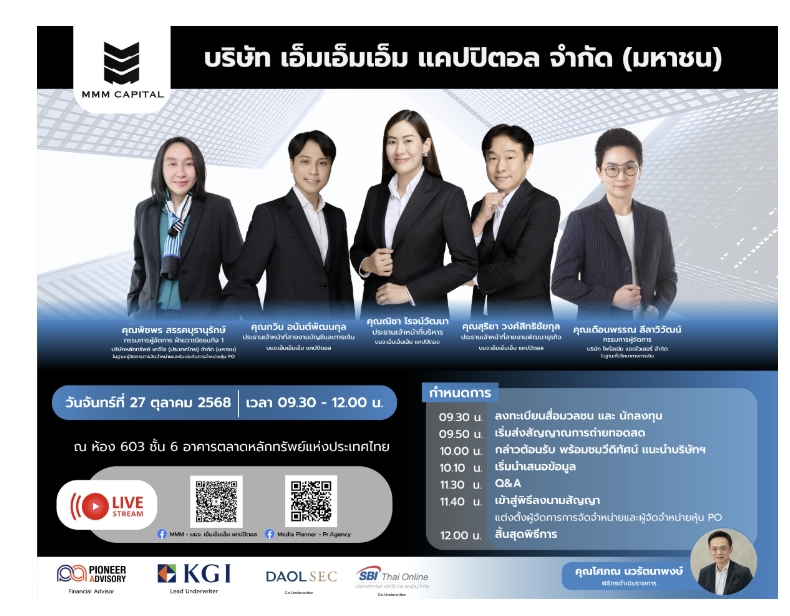 สำนักข่าวหุ้นอินไซด์( 24 ตุลาคม 2568)----บมจ.เอ็มเอ็มเอ็ม แคปปิตอล หรือ MMM เตรียมลุย "Press Conference & Retail Investor Roadshow" ในรูปแบบ Hybrid นำเสนอขายหุ้นสามัญเพิ่มทุนให้กับประชาชนทั่วไป (PO) จำนวนไม่เกิน 64.2 ล้านหุ้น ในวันที่ 27 ตุลาคมนี้ ตอกย้ำความเชื่อมั่นนักลงทุนก่อนเสนอขาย เร็วๆ นี้
