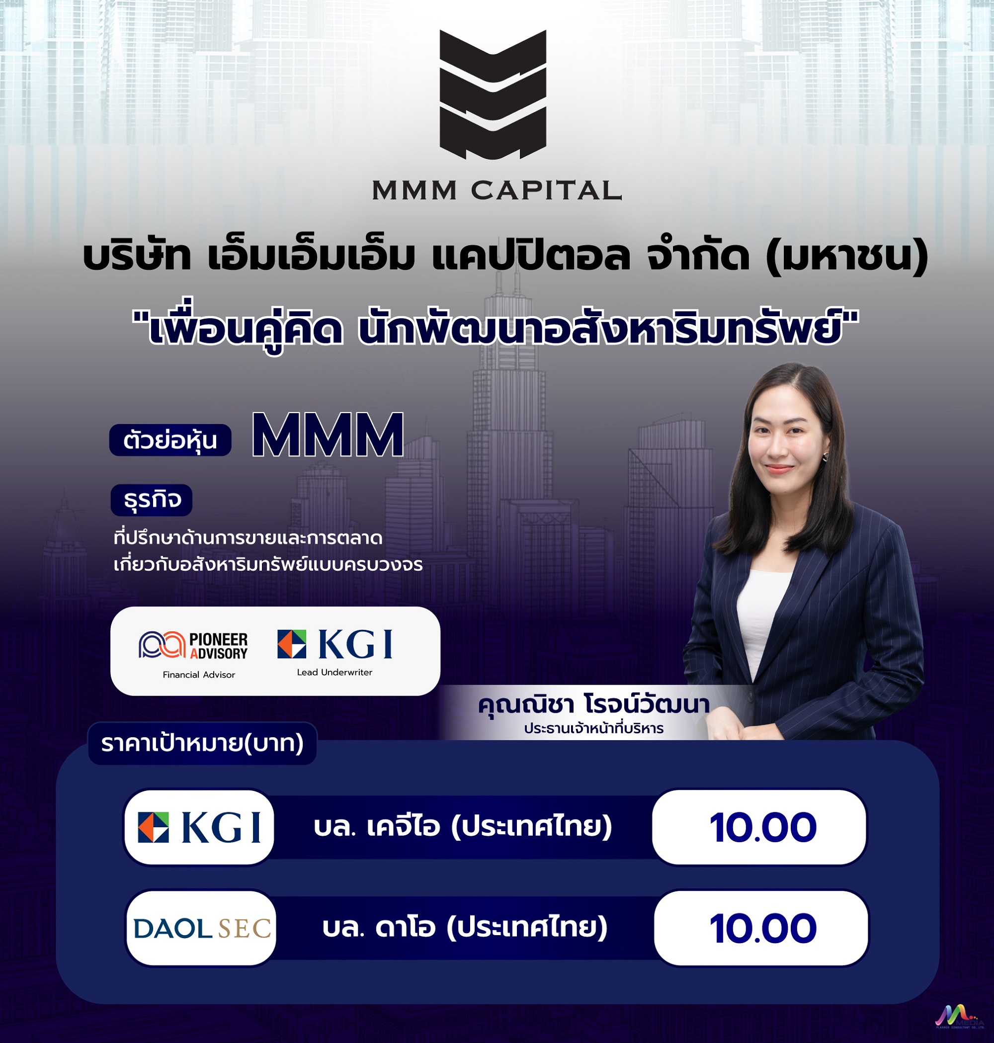 สำนักข่าวหุ้นอินไซด์( 3 พฤศจิกายน 2568 )-------บมจ.เอ็มเอ็มเอ็ม แคปปิตอล "MMM" ประกาศตอกย้ำ Business Model ในการเป็น "โบรกเกอร์ อสังหาริมทรัพย์"แบบครบวงจร ภายใต้จุดเด่นในการวางตำแหน่งของบริษัทฯ เป็น "มินิมาร์ทอสังหาริมทรัพย์" พร้อมนำร่องรายแรกจากตลาด LiVEx สู่ตลาดหลักทรัพย์ mai  เล็ง ระดมทุนขยายพอร์ตธุรกิจ 3 BU เร่งต่อยอดการเติบโตในอนาคต ด้าน บล.เคจีไอ -บล.ดาโอ สแกนหุ้น น้องใหม่ "MMM" เคาะราคาเป้าหมาย 10.00 บาท/หุ้น