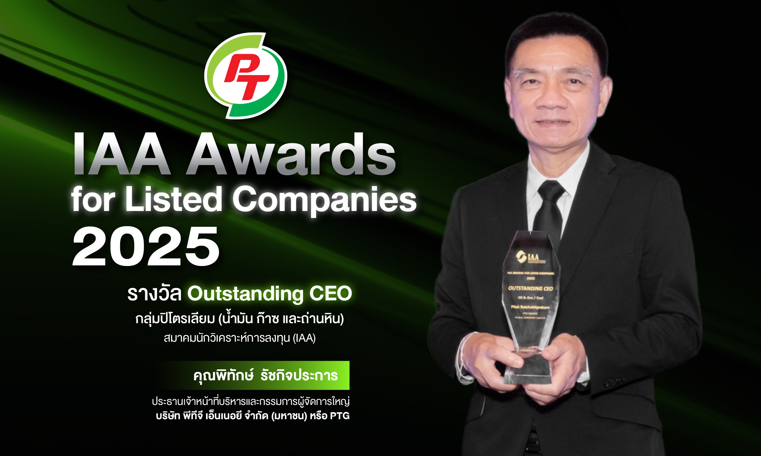 สำนักข่าวหุ้นอินไซด์(5 พฤศจิกายน 2568)----นายพิทักษ์ รัชกิจประการ ประธานเจ้าหน้าที่บริหารและกรรมการผู้จัดการใหญ่ บมจ.พีทีจี เอ็นเนอยี (PTG) เข้ารับรางวัล IAA Awards for Listed Companies 2025 สาขา "Outstanding CEO" ประเภทกลุ่มอุตสาหกรรมปิโตรเลียม (น้ำมันและก๊าซ) จากการเสนอชื่อและให้คะแนนของนักวิเคราะห์และผู้จัดการกองทุนของบริษัทหลักทรัพย์ ซึ่งจัดโดยสมาคมนักวิเคราะห์การลงทุน (IAA) เพื่อสะท้อนการบริหารงานดีเด่น รวมถึงจรรยาบรรณ และบรรษัทภิบาลในการดำเนินธุรกิจ ทั้งยังสามารถนำพาองค์กรให้เติบโตก้าวหน้าอย่างยั่งยืน