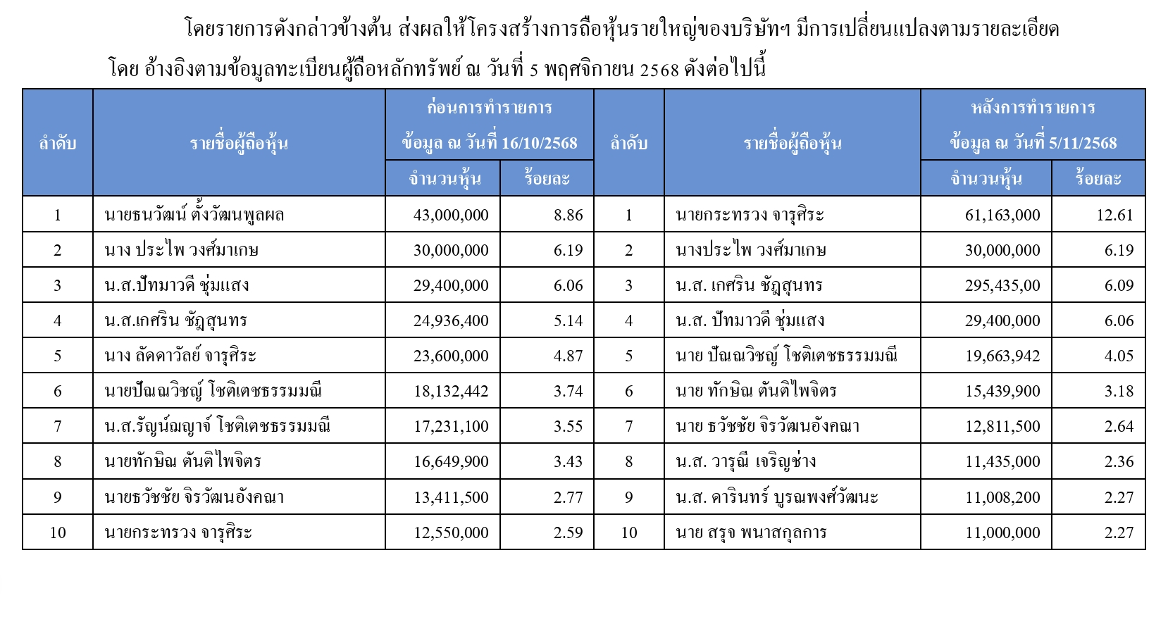 สำนักข่าวหุ้นอินไซด์( 11 พฤศจิกายน 2568 )------บริษัท ออริจิ้น โกลบอล เอมไพร์ จำกัด (มหาชน) EMPIRE เปิดเผยว่า “บริษัทฯ” ขอแจ้งการเปลี่ยนแปลงผู้ถือหุ้นรายใหญ่ โดยอ้างอิง จากแบบรายงานการได้มาหรือจำหน่ายหลักทรัพย์ของกิจการ (แบบ 246-2) ซึ่ง นายกระทรวง จารุศิระ ได้ทำการยื่นต่อ สำนักงานคณะกรรมการกำกับหลักทรัพย์และตลาดหลักทรัพย์ (สำนักงาน ก.ล.ต.) ดังนี้1. เมื่อวันที่ 4 พฤศจิกายน 2568 นายกระทรวง จารุศิระ ได้ทำการได้มาซึ่งหุ้นสามัญของบริษัทฯ โดยวิธีการผ่าน ตลาดหลักทรัพย์โดยผ่านบริษัทหลักทรัพย์ และซื้อขายกันโดยตรงกับนายอัครพงศ์ ประสิทธิ์อยู่ศีล และนาย ธนวัฒน์ ตั้งวัฒนพูลผล ซึ่ง ณ วันที่ 4 พฤศจิกายน 2568 นายกระทรวง จารุศิระ เป็นผู้ถือหุ้นของบริษัท คิดเป็นร้อยละ 12.2989ทั้งนี้การเปลี่ยนแปลงโครงสร้างการถือหุ้นดังกล่าว ในขณะนี้ไม่มีผลกระทบต่อการเปลี่ยนแปลงอำนาจการ ควบคุมโครงสร้างการบริหารงาน ตลอดจนการกำหนดนโยบายการดำเนินธุรกิจของบริษัทฯ และมิได้เข้าเกณฑ์ในการทำคำ เสนอซื้อหุ้นต่อผู้ถือหุ้นทั่วไป (Tender Offer) แต่อย่างใด