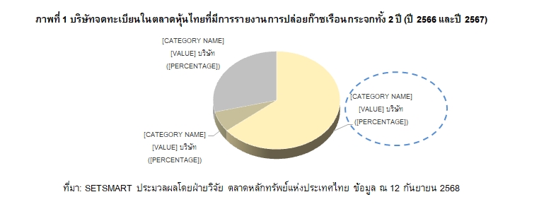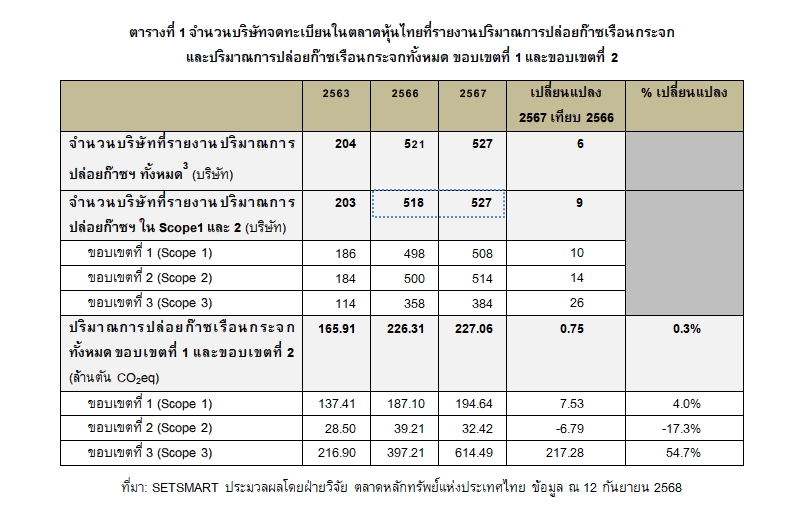 จากรายงาน SET Note ฉบับที่ 14/2568 แสดงให้เห็นว่า ในปี 2567 ไทยปล่อยก๊าซเรือนกระจกสูงเป็นอันดับ 3 ของอาเซียน และเป็นอันดับ 21 ของโลก ด้วยปริมาณ 422 ล้านตันคาร์บอนไดออกไซต์เทียบเท่า (ล้านตัน CO2eq) เพิ่มขึ้น 2.9% จากปี 2566 และในรายงานฉบับนี้ศึกษาถึงการปล่อยก๊าซเรือนกระจกของบริษัทจดทะเบียนในตลาดหลักทรัพย์แห่งประเทศไทยและตลาดหลักทรัพย์   เอ็ม เอ ไอ (ตลาดหุ้นไทย) พบว่า ในปี 2567 บริษัทจดทะเบียนจำนวน 527 บริษัทจากทั้งหมด 861 บริษัท (91.4% ของมูลค่าหลักทรัพย์รวมทั้งตลาด) ได้เปิดเผยข้อมูลเกี่ยวกับปริมาณการปล่อยก๊าซเรือนกระจก  (ตารางที่ 1) และจากข้อมูลตั้งแต่ปี 2563 ถึงปัจจุบัน (ปี 2567) พบว่า บริษัทจดทะเบียนให้ความสำคัญกับการเปิดเผยข้อมูลการปล่อยก๊าซเรือนกระจก (ปล่อยก๊าซฯ) มากยิ่งขึ้น สังเกตได้จากบริษัทจดทะเบียนที่เปิดเผยข้อมูลปริมาณการปล่อยก๊าซฯ ที่มีจำนวนเพิ่มขึ้น