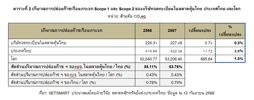 •    ปี 2567 บริษัทจดทะเบียนในตลาดหุ้นไทยปล่อยก๊าซเรือนกระจก (ปล่อยก๊าซฯ) ในส่วน Scope 1 และ Scope 2 รวม 227.06 ล้านตันคาร์บอนไดออกไซต์เทียบเท่า (ล้านตัน CO2eq)  หรือเพิ่มขึ้น 0.3% จากปี 2566 ซึ่งเพิ่มขึ้นในอัตราที่น้อยกว่าภาพรวมของไทยที่ปล่อยก๊าซฯ เพิ่มขึ้น 2.9%