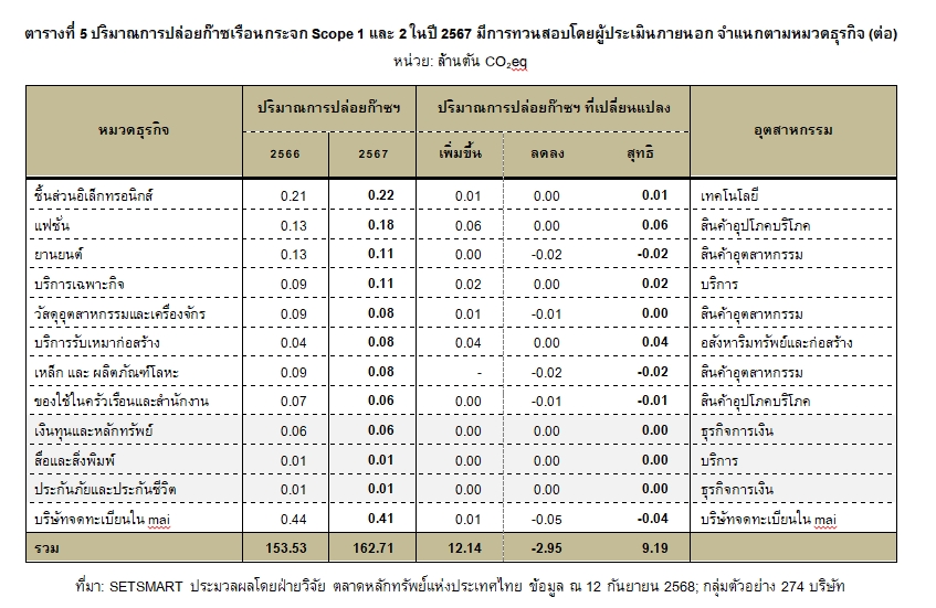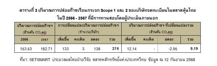 บริษัทจดทะเบียน 274 บริษัทเปิดเผยข้อมูลข้อมูลการปล่อยก๊าซฯ ในปี 2566 และปี 2567 และมีการทวนสอบข้อมูลแล้ว พบว่า 138 บริษัทปล่อยก๊าซฯ ลดลง ขณะที่ 133 บริษัทปล่อยก๊าซฯ เพิ่มขึ้น อย่างไรก็ตาม ปริมาณการปล่อยก๊าซฯ รวมมีปริมาณเพิ่มขึ้น 9.19 ล้านตัน CO2eq จากปี 2566