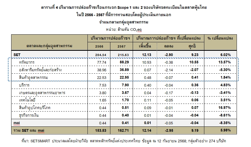 ในกลุ่มบริษัทจดทะเบียนที่ทำการศึกษา พบว่า บริษัทจดทะเบียนที่ปล่อยก๊าซฯ ลดลงมีจำนวน 138 บริษัท ซึ่งมากกว่าจำนวนบริษัทจดทะเบียนที่ปล่อยก๊าซฯ เพิ่มขึ้นที่มีจำนวน 133 บริษัท ขณะที่ 3 บริษัทรายงานว่าปล่อยก๊าซฯ เท่าเดิม และบริษัทจดทะเบียนกลุ่มนี้ปล่อยก๊าซฯ รวมเพิ่มขึ้น 9.19 ล้านตัน CO2eq (ตารางที่ 3) หรือเพิ่มขึ้น 5.98% จากปี 2566
