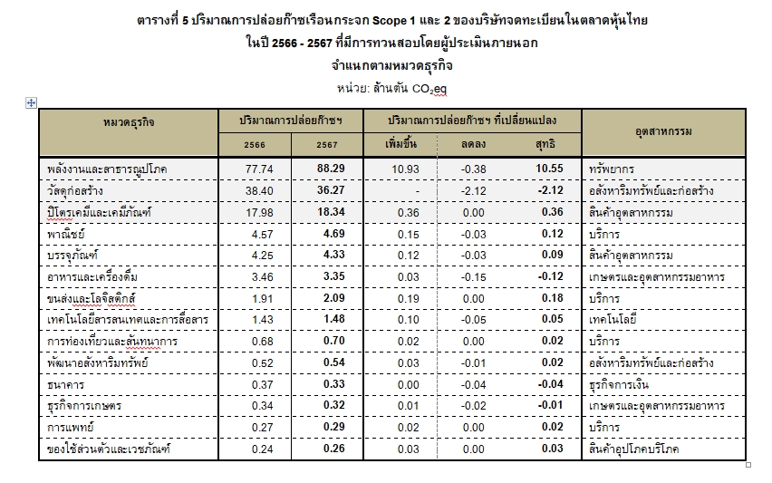 ในปี 2567 หมวดวัสดุก่อสร้างลดปริมาณการปล่อยก๊าซเรือนกระจกได้มากที่สุด ขณะที่หมวดพลังงานและสาธารณูปโภคเป็นหมวดธุรกิจที่ปล่อยก๊าซเรือนกระจกมากที่สุดและปล่อยก๊าซเพิ่มขึ้นมากที่สุดด้วย