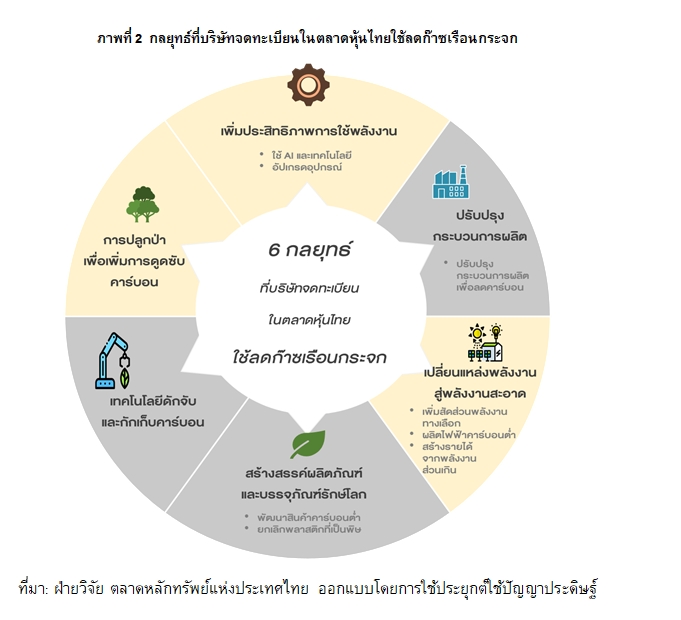 •    บริษัทจดทะเบียนวางแผนลดก๊าซเรือนกระจกผ่าน 6 กลยุทธ์ ได้แก่ 1) เพิ่มประสิทธิภาพการใช้พลังงานด้วย AI 2) ปรับปรุงกระบวนการผลิต 3) เปลี่ยนผ่านสู่พลังงานสะอาด 4) พัฒนาผลิตภัณฑ์คาร์บอนต่ำ 5) พัฒนาเทคโนโลยีเทคโนโลยีการดักจับและกักเก็บก๊าซคาร์บอนไดออกไซด์ และ 6) เพิ่มพื้นที่สีเขียว