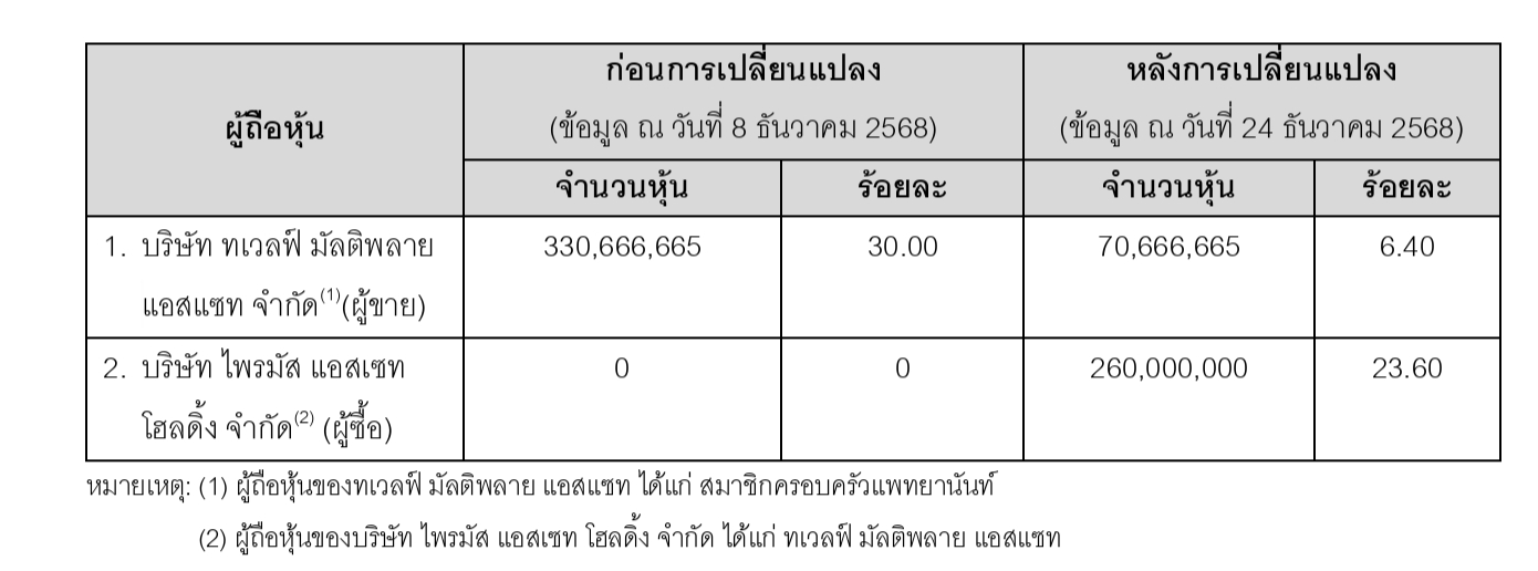 สำนักข่าวหุ้นอินไซด์( 24 ธันวาคม 2568 )------- บริษัท เจ้าพระยามหานคร จำกัด (มหาชน) CMC เปิดเผยว่า บริษัทฯ ได้รับแจ้งจากบริษัท ทเวลฟ์ มัลติพลาย แอสแซท จำกัด (“ทเวลฟ์ มัลติพลาย แอสแซท”) ซึ่งเป็นผู้ถือหุ้นรายใหญ่ของบริษัทฯ เกี่ยวกับการปรับ โครงสร้างภายในของกลุ่ม เนื่องจากบริษัท ทเวลฟ์ มัลติพลาย แอสแซท จำกัด ประสงค์ที่จะประกอบกิจการอื่นและ ประสงค์ให้บริษัท ไพรมัส แอสเซท โฮลดิ้ง จำกัด เป็นบริษัทโฮลดิ้ง แทนบริษัท ทเวลฟ์ มัลติพลาย แอสแซท จำกัด เพื่อประกอบกิจการการลงทุนในประเทศและต่างประเทศในอนาคต โดยบริษัท ทเวลฟ์ มัลติพลาย แอสแซท จำกัด ได้ดำเนินการขายหุ้นของบริษัทฯ ประมาณร้อยละ 23.60 ของจำนวนหุ้นที่ออกและจำหน่ายแล้วทั้งหมดและของทุนชำระ แล้วของบริษัทฯ ให้แก่บริษัท ไพรมัส แอสเซท โฮลดิ้ง จำกัด ซึ่งเป็นบริษัทที่บริษัท ทเวลฟ์ มัลติพลาย แอสแซท จำกัด ถือหุ้นในสัดส่วนที่ไม่น้อยกว่าร้อยละ 90 ทั้งนี้ การซื้อขายหุ้นดังกล่าวส่งผลให้มีการเปลี่ยนแปลงโครงสร้างการถือหุ้นของผู้ถือหุ้นรายใหญ่ของบริษัทฯ ดังต่อไปนี้