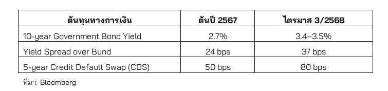 หลังจากที่ฝรั่งเศสถูกปรับลดอันดับความน่าเชื่อถือในช่วงเดือก.ย.-ต.ค. 2568 ที่ผ่านมา พบว่าต้นทุนทางการเงินของรัฐบาลฝรั่งเศสเพิ่มสูงขึ้น ซึ่งยิ่งเพิ่มภาระทางการคลังและเป็นข้อจำกัดของรัฐบาลในการลงทุนโครงสร้างพื้นฐาน การใช้จ่ายด้านสวัสดิการ หรือออกมาตรการกระตุ้นเศรษฐกิจเพื่อรองรับแรงกระแทกทางเศรษฐกิจในอนาคต และหากสถานการณ์นี้ยืดเยื้อออกไป ความเชื่อมั่นของนักลงทุนอาจลดลง และกระทบต่อการขยายตัวทางเศรษฐกิจของประเทศได้ สะท้อนจากตัวชี้วัดต้นทุนทางการเงิน ดังนี้