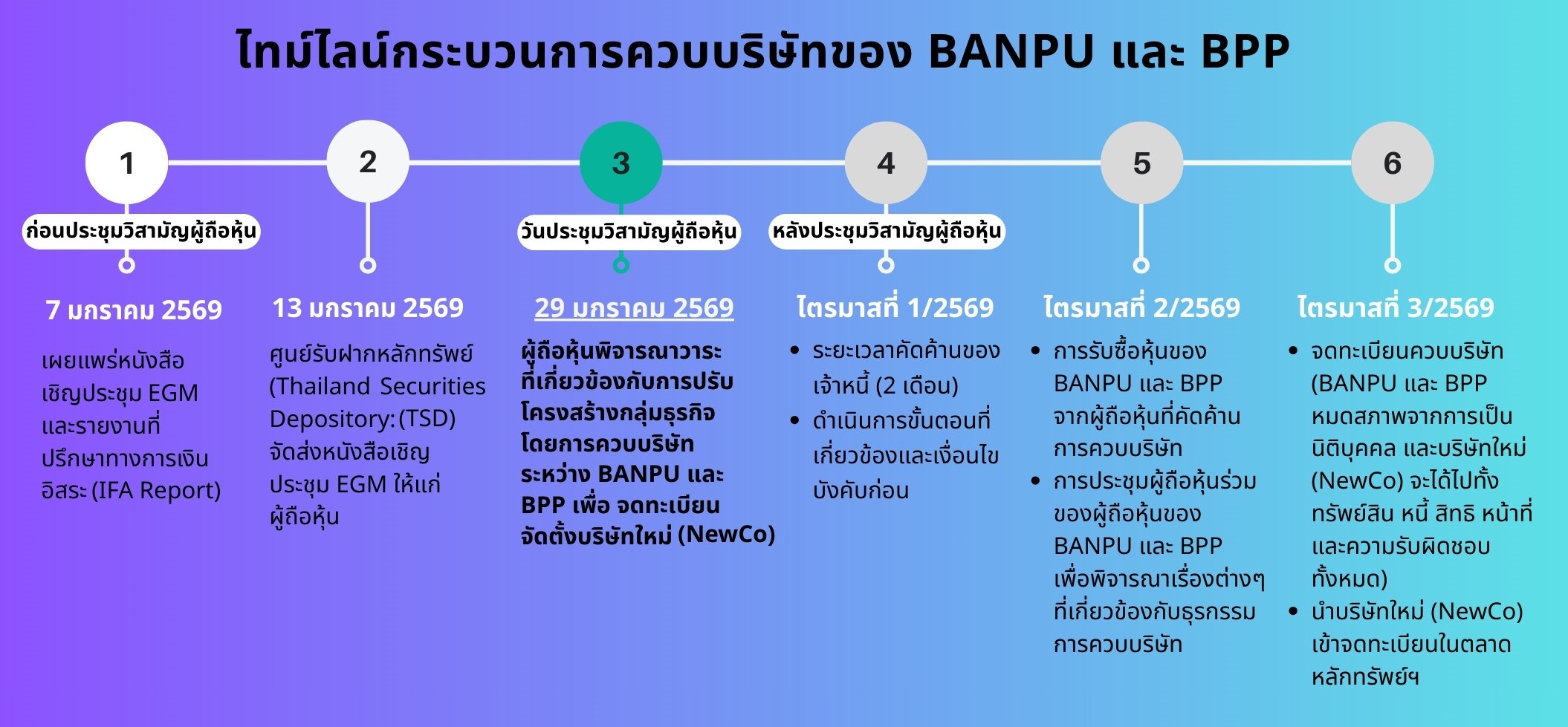 โดยก่อนหน้านี้ บริษัทฯ ได้ดำเนินการทำคำเสนอซื้อหุ้น BPP ที่เหลือทั้งหมดเป็นการทั่วไป (General Offer) ตามขั้นตอนที่เกี่ยวข้องจนแล้วเสร็จ ซึ่งส่งผลให้สัดส่วนการถือหุ้นของบริษัทฯ ใน BPP เพิ่มขึ้นจากร้อยละ 78.66 เป็นร้อยละ 91.07 ของหุ้นที่ออกและจำหน่ายได้แล้วทั้งหมดของ BPP และภายหลังการดำเนินธุรกรรมดังกล่าว บริษัทฯ ได้แจ้งอัตราส่วนการแลกหุ้นสุดท้าย (Final Swap Ratio) ต่อตลาดหลักทรัพย์ฯ เมื่อวันที่ 26 ธันวาคม 2568 โดยผู้ถือหุ้นบริษัทฯ จะได้รับหุ้นบริษัทใหม่ในอัตรา 1 หุ้นเดิมในบริษัทฯ ต่อ 0.38242 หุ้นในบริษัทใหม่ และ ผู้ถือหุ้น BPP จะได้รับหุ้นบริษัทใหม่ในอัตรา 1 หุ้นเดิมต่อ 0.80208 หุ้นในบริษัทใหม่