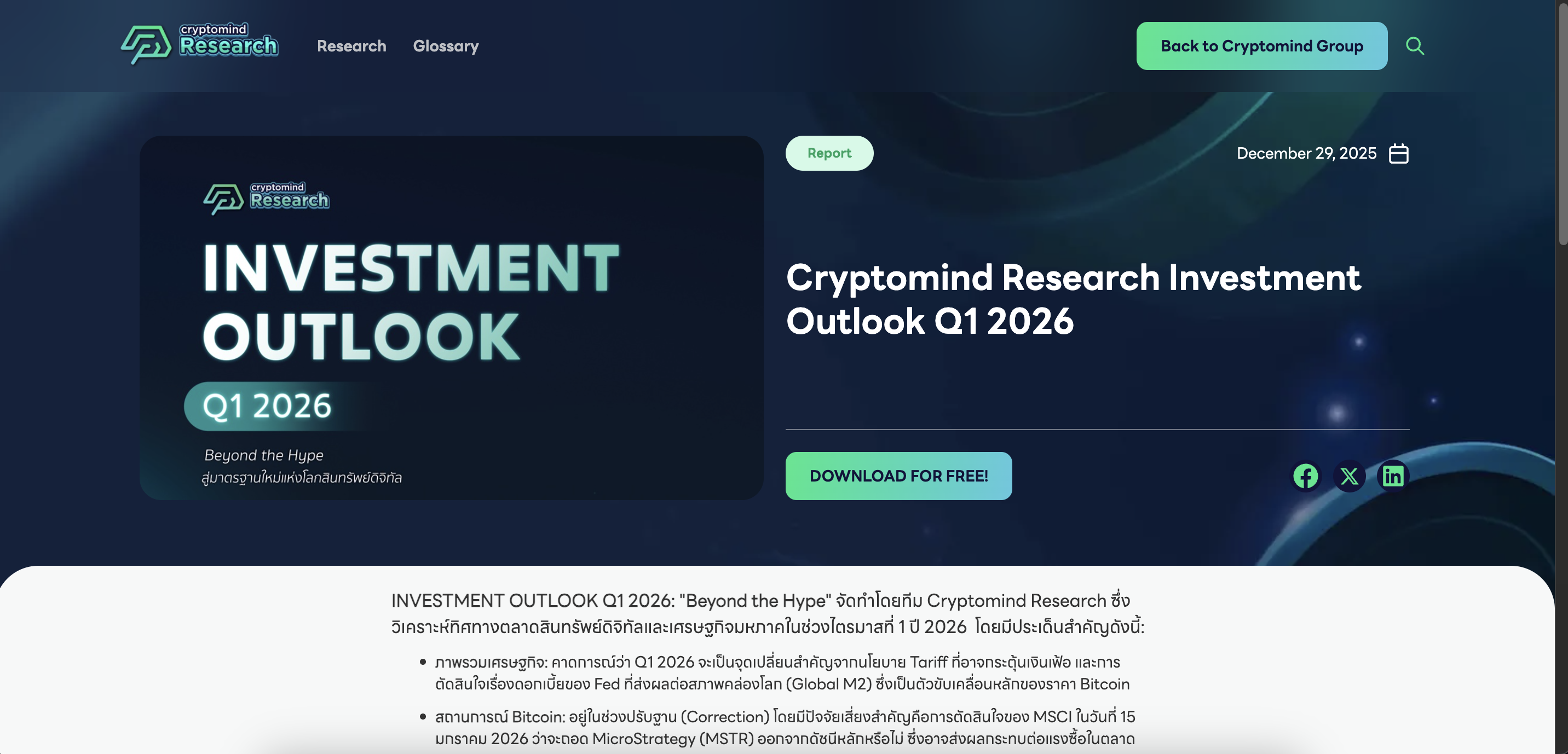 สำนักข่าวหุ้นอินไซด์ (16 มกราคม 2569 )-----ท่ามกลางเศรษฐกิจโลกที่กำลังเปลี่ยนผ่านสู่ยุคสภาพคล่องใหม่ Investment Outlook Q1/2026 : Beyond the Hype สู่มาตรฐานใหม่แห่งโลกสินทรัพย์ดิจิทัล จากทีมวิเคราะห์ของ เมอร์เคิล แคปปิตอล (Merkle Capital) และ คริปโตมายด์ กรุ๊ป โฮลดิ้งส์ (Cryptomind Group Holding) ชี้ทิศทางการลงทุน เจาะลึกปัจจัยมหภาค การยอมรับสินทรัพย์ดิจิทัลจากสถาบัน และโอกาสการเติบโตเชิงโครงสร้างของตลาดคริปโทฯ ในปี 2026