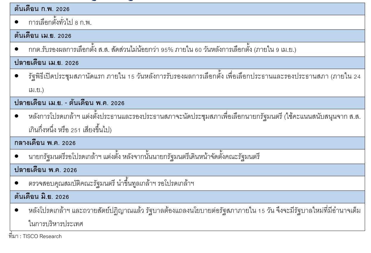 บริษัทหลักทรัพย์ ทิสโก้ จำกัด  ออกบทวิเคราะห์   SET Index ยังแกว่งตัวอยู่ในกรอบจำกัด ไม่แตกต่างอย่างมีนัยสำคัญจากช่วง 2-4 สัปดาห์ก่อนหน้านี้ เนื่องจากนักลงทุนส่วนใหญ่อยู่ในโหมดระมัดระวัง รอความชัดเจนของผลการเลือกตั้ง  เรามองคะแนนเสียงหลังการเลือกตั้งจะเป็นตัวกำหนดะระยะเวลาในการเปลี่ยนผ่านของรัฐบาลใหม่ การใช้จ่ายภาครัฐ และโอกาสการเกิดความล่าช้าในการจัดทำงบประมาณปี FY2027  ในกรณีฐานหลังการเลือกตั้ง เราคาดจะได้รัฐบาลใหม่ที่มีอำนาจเต็มภายในไตรมาส 2 แต่หากการจัดตั้งรัฐบาลใหม่มีความล่าช้าเกินกว่าไตรมาส 2 คาดจะส่งผลให้งบประมาณปี FY2027 มีความล่าช้ามากกว่า 2 เดือนจากปกติที่จะเริ่มปีงบประมาณใหม่ในเดือน ต.ค. ของทุกปี โดยหากงบประมาณปี 2027 เริ่มเบิกจ่ายได้ในต้นปีถัดไป เราประเมินว่าจะส่งผลลบต่อเศรษฐกิจราว 0.3 ppt จากสมมติฐานประมาณเศรษฐกิจปีนี้ที่เราคาดว่าจะเติบโต 1.6% และมีความเสี่ยงที่ SET Index อาจถอยลงทดสอบระดับ 1200 จุดหรือต่ำกว่าได้