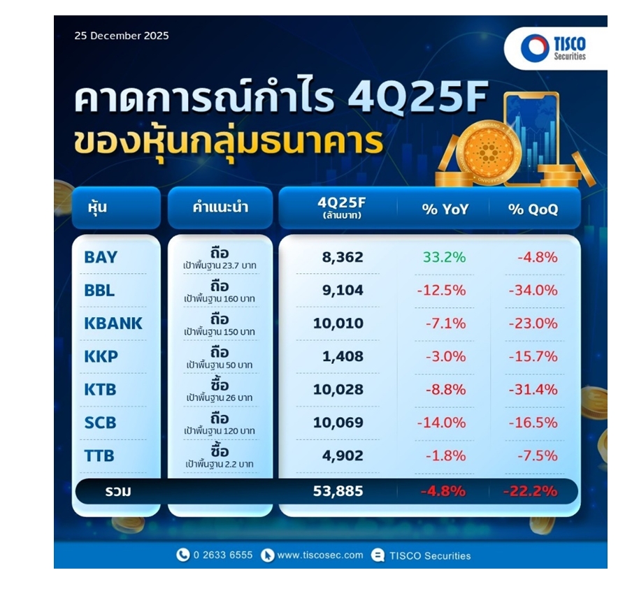 กลุ่ม BANK จะเริ่มทยอยประกาศผลประกอบการ 4Q25F แล้วในช่วงสัปดาห์นี้ต่อเนื่องถึงกลางสัปดาห์หน้า เราคาดว่าธนาคารทั้ง 7 แห่งภายใต้การวิเคราะห์ของเราจะมีกำไรสุทธิรวมอยู่ที่ 5.38 หมื่นล้านบาท ลดลงอย่างมีนัยสำคัญ -22% QoQ และ -5% YoY เนื่องจากเราไม่คาดว่าจะมีกำไรจากพอร์ตการลงทุนในพันธบัตรรัฐบาลเหมือนไตรมาสก่อน ๆ หน้านี้ หลังอัตราผลตอบแทนพันธบัตรรัฐบาลไทยอายุ 10 ปีขยับขึ้นมาอยู่ที่ 1.6% ณ สิ้น 4Q25 vs 1.4% ณ สิ้น 3Q25 ขณะที่รายได้ส่วนอื่น ๆ คาดว่าจะอ่อนตัวลงอีกจากการปรับลดอัตราดอกเบี้ยนโยบาย ซึ่งได้รับผลกระทบเต็มที่จากการลดดอกเบี้ยในเดือน ส.ค. และปรับลดอีกครั้งในช่วงปลายเดือน ธ.ค. ที่ผ่านมา ส่งผลให้ส่วนต่างรายได้ดอกเบี้ยสุทธิ (NIM) มีแนวโน้มลดลง ท่ามกลางพอร์ตสินเชื่อไม่เติบโต และต้นทุนเครดิตที่คาดยังทรงตัวได้ตาม NPL ที่ไม่ได้เพิ่มขึ้นจากมาตรการความช่วยเหลือในการปรับโครงสร้างหนี้  อนึ่ง หุ้นที่ประกาศงบแล้วในช่วงไม่กี่วันที่ผ่านมา อาทิ TISCO ออกงบตามตลาดคาด ขณะที่ AEONTS และ KTC น้อยกว่าตลาดคาด และดีกว่าตลาดคาด ตามลำดับ