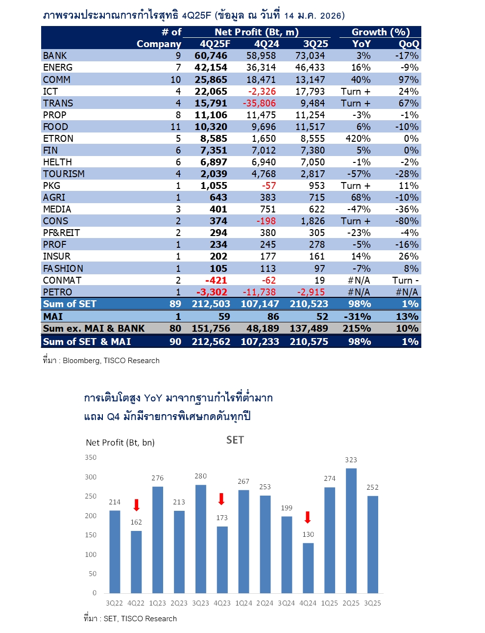สำหรับภาพรวมกำไรบจ.ไทยทั้งหมดใน 4Q25F จากคาดการณ์ผลประกอบการของตลาด (Bloomberg Consensus) รวม 89 บริษัท คิดเป็น 79% ของมูลค่าตลาดรวมของหุ้นสามัญที่จดทะเบียนใน SET (ข้อมูล ณ วันที่ 14 ม.ค.) คาดจะมีกำไรสุทธิรวม 2.12 แสนล้านบาท เพิ่มขึ้นก้าวกระโดดเกือบเท่าตัว YoY แต่ทรงตัว QoQ