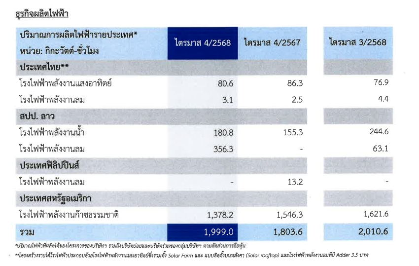 ในไตรมาส 4/2568 ภาพรวมปริมาณการผลิตไฟฟ้าของกลุ่มบริษัทฯ เพิ่มขึ้นจากไตรมาส 4/2567 โดยมีสาเหตุหลักจากการเปิดดำเนินการเชิงพาณิชย์ หรือ COD (Commerdal Operation Date) เต็มรูปแบบของโครงการโรงไฟฟ้าพลังงานลม Monsoon ซึ่งมีขนาดกำลังการผลิตติตติดตั้งรวม 600 เมกะวัตต์ใน สปป.ลาว ประกอบกับปริมาณน้ำที่เพิ่มขึ้น ส่งผลให้ปริมาณการผลิตไฟฟ้าจากโรงไฟฟ้าพลังน้ำใน สปป.ลาว ปรับตัวสูงขึ้น ขณะที่ปริมาณการผลิตไฟฟ้าในประเทศไทยของโรงไฟฟ้าพลังงานลมมีปริมาณการผลิตไฟฟ้าที่เพิ่มขึ้นตามความเร็วลมที่สูงขึ้น ส่วนปริมาณการผลิตไฟฟ้าของโรงไฟฟ้าพลังงานแสงอาทิตย์ลดลงตามค่าความเข้มแสงที่ลดลง